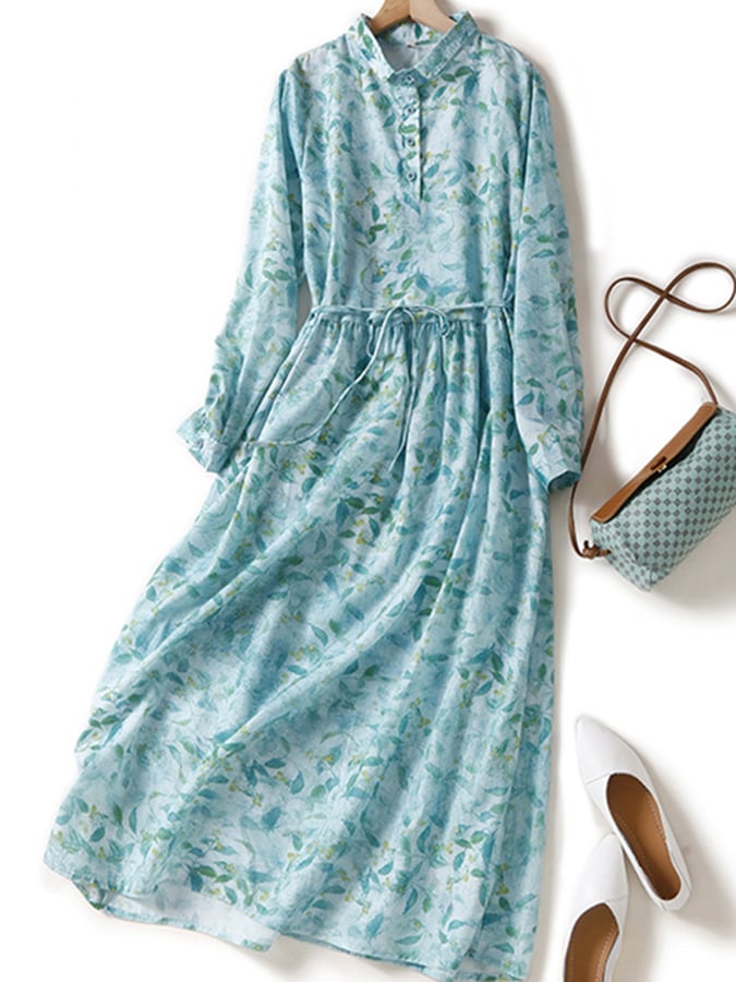 Cotton Floral Tie Lapel Button Dress