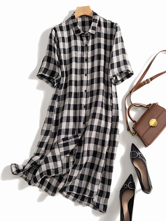 Polo Neck Short Sleeved Plaid Linen Shirt Skirt