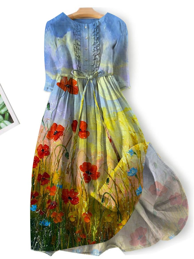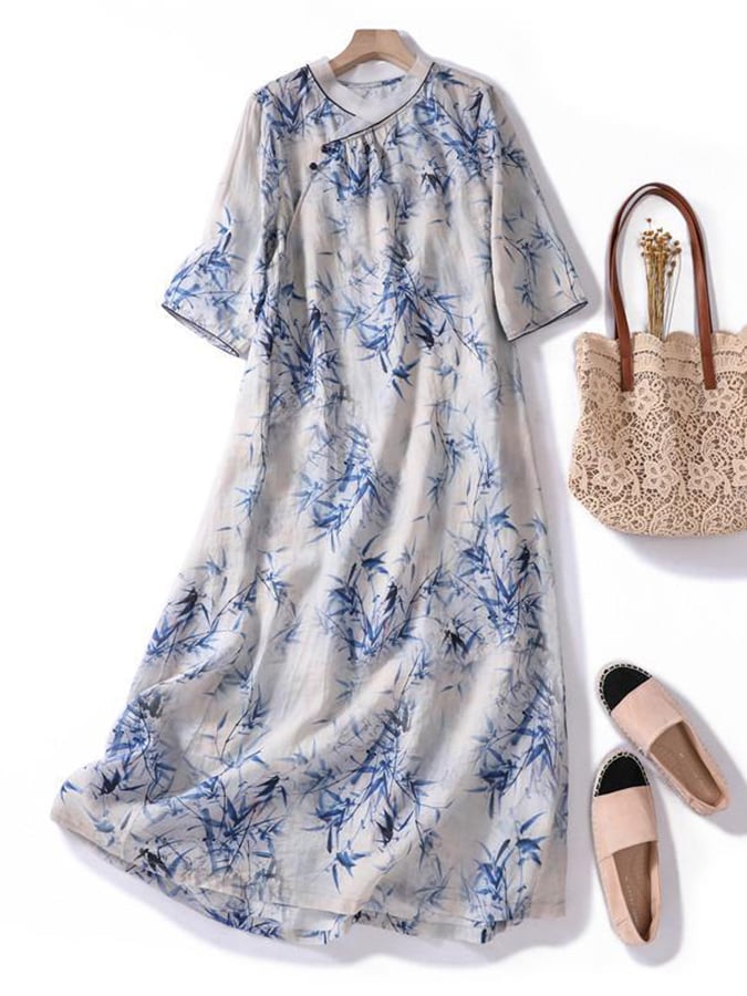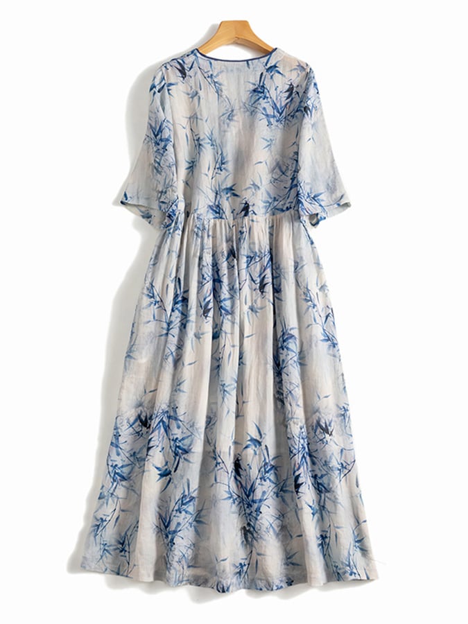 Floral Cotton Linen V-Neck Printed Swing Dress